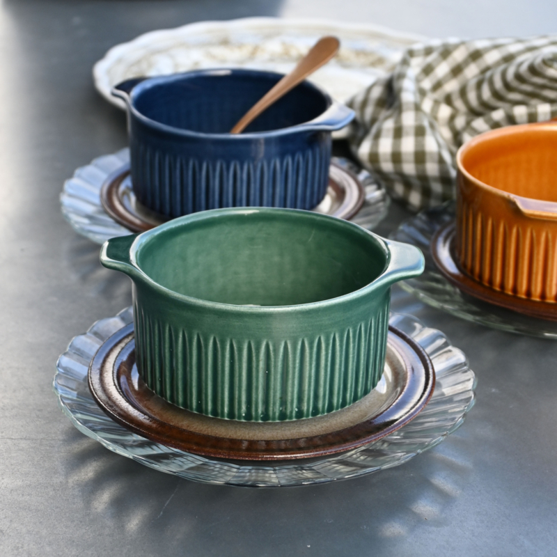 Suiker en melkset - Vierdelig - Set voor olie, zeezout en kruiden - vintage - St Clement FranceBliekTofTafelen - Vintage servies - Vintage aardewerk - St Clement France - Groen - Vintage - Kannetje nr 5024 - Pot nr 5033-4 - Schaaltje nr 4674