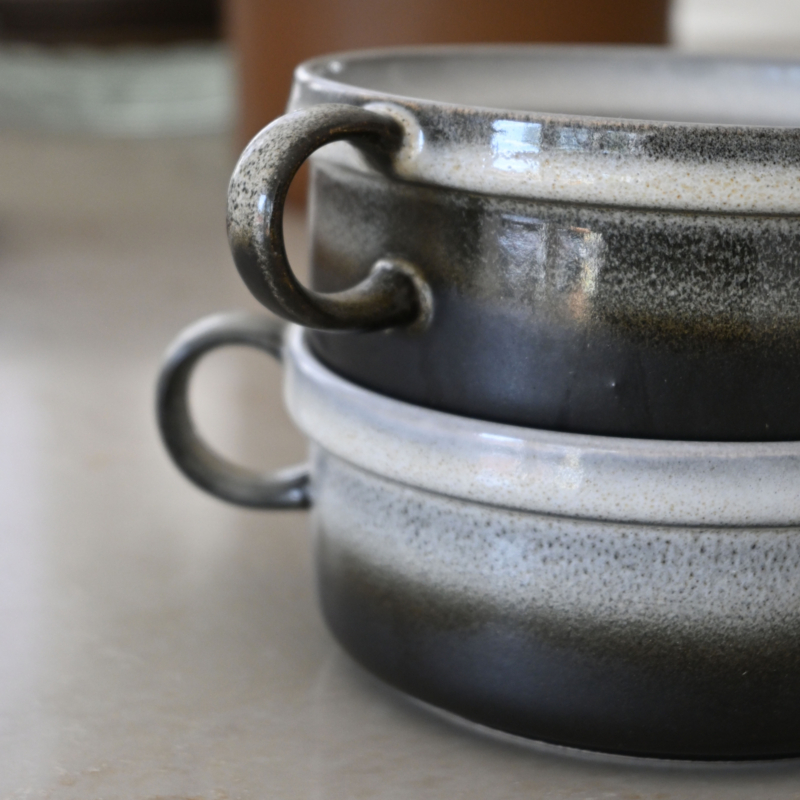Kom - Schaal - Set van TWEE - Melitta Friesland Germany - Kom met twee oren - Binnenzijde glanzend geglazuurd in wit niet dekkend - Buitenzijde onderrand mat diep donkerbruin geglazuurd - Bovenrand gespikkeld wit met bruin glanzend geglazuurd - Voor soep, een yoghurtje, voor de hapjes bij de borrel - Uit de collectie van Melitta Friesland Germany