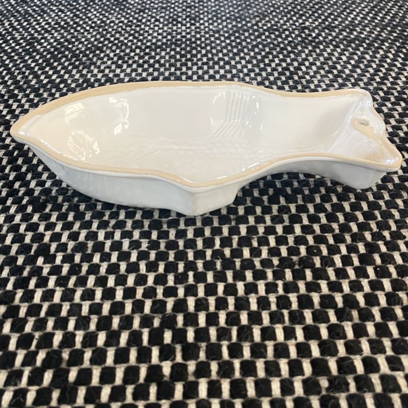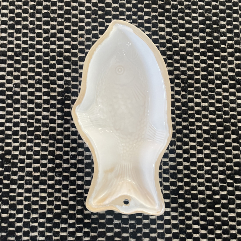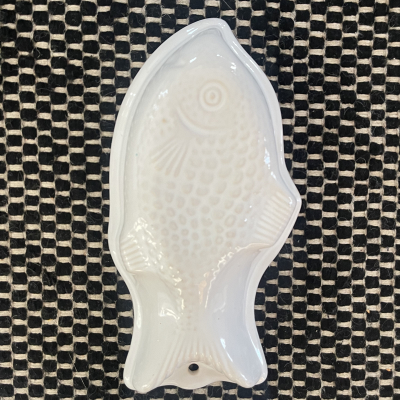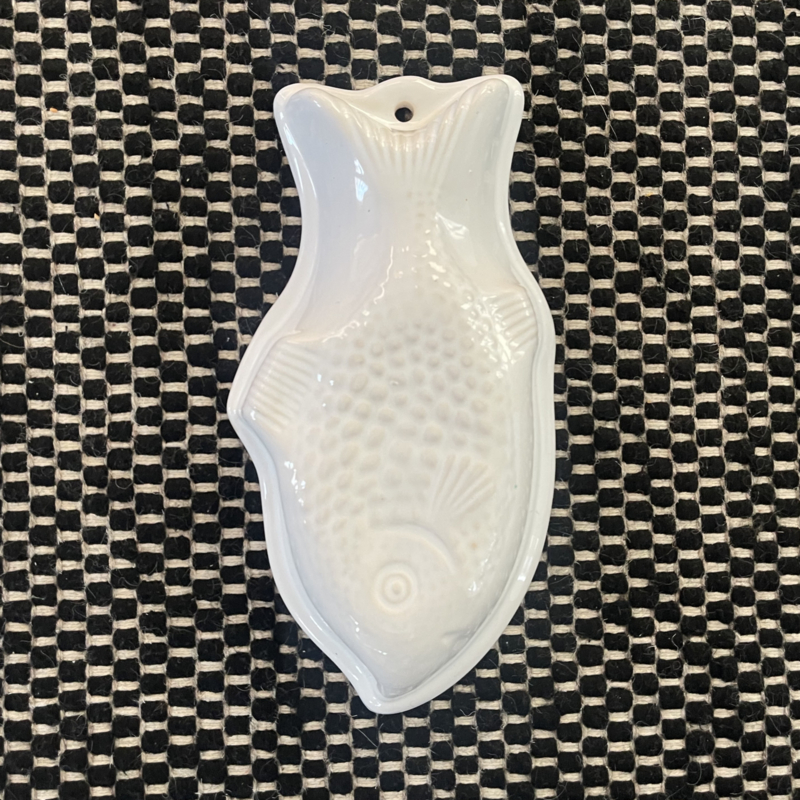 Schaal - Puddingvorm - Vis - Vintage - Wit - Reliëf - Met ingebakken ophangoog - Decoratief aan de wand - Decoratief vintage item in de keuken - Voor een toffe 'VIS-pudding' !