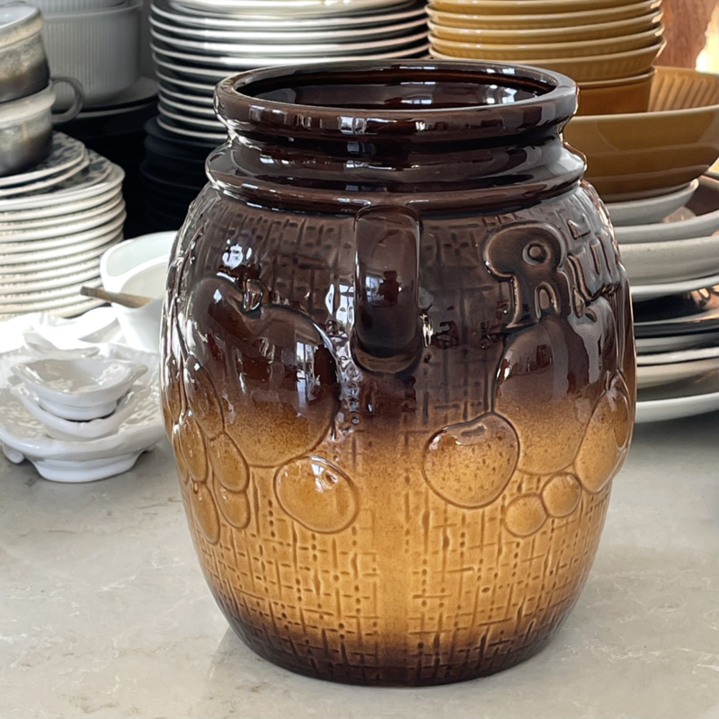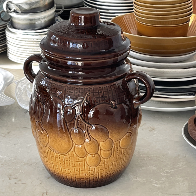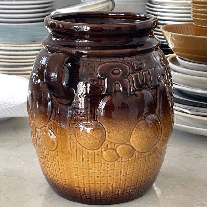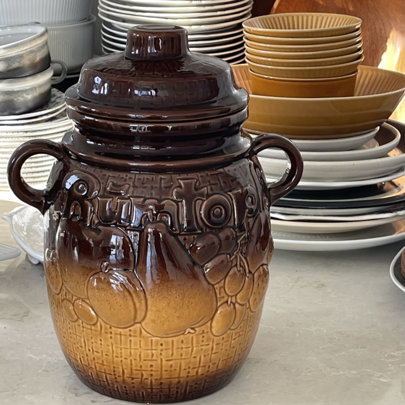Rümtopf - Vintage - Scheurich Keramiek W-Germany - Op de onderzijde van de pot met deksel staat oa het nummer 820-28 - Donkerbruin/Okergeel- Twee zijden met fruitdessin in reliëf - Eën zijde ook met tekst Rümtopf in reliëf erbij - Twee handvatten - Losse deksel - Tof vintage item voor in de keuken. - Voor oa het bereiden van fruit met rum - Voor op rum ingemaakte vruchten - Bowl....